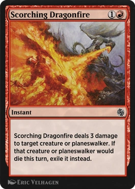| Text | Scorching Dragonfire deals 3 damage to target creature or planeswalker. If that creature or planeswalker would die this turn, exile it instead. |